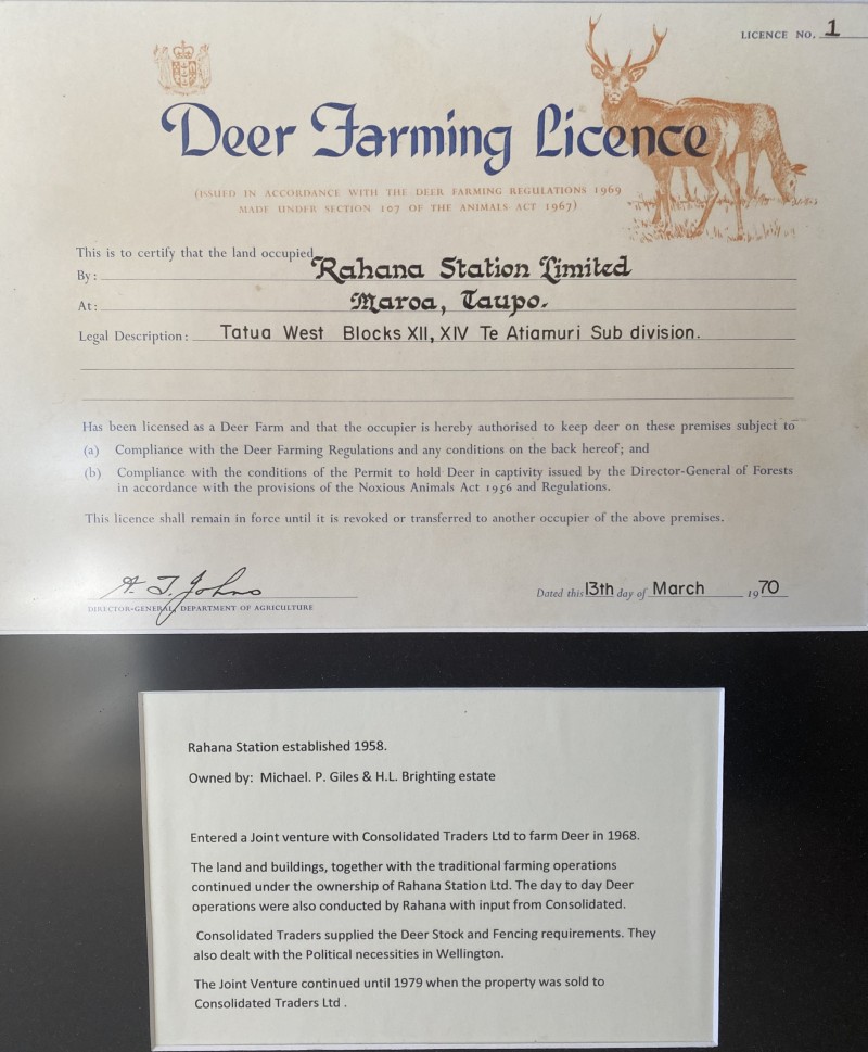 My family is going through old records and we thought you would like a copy of Deer Farming Licence No. 1 issued to our father's (Michael Giles) station just north of Taupo, in 1970.